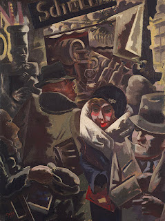 After serving during  I World War, Grosz settled in Berlin and joined the Dada movement. Far more political than their counterparts in Zurich or Paris, the Berlin Dadaists turned their art against local figures and institutions of authority. In paintings, watercolors, and collages, Grosz mixed the schematic simplicities of popular illustration with Expressionist distortion, Futurist fragmentation, and the mordant accuracy of the realism known as the Neue Sachlichkeit (New Objectivity). In Grosz’s art, the modern city is a hellish, jostling place overpopulated by swinish capitalists, brutish soldiers, and degraded workers. Women are prostitutes or nouveaux riches hags.